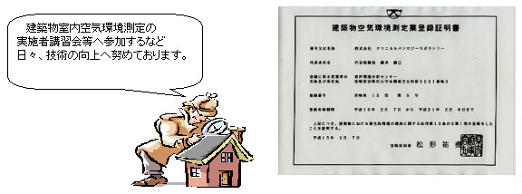 なお、今回の学校環境衛生基準の改訂に伴う、室内空気環境測定の実施にあたり、「建築物空気環境測定事業所」の資格を取得致しました。